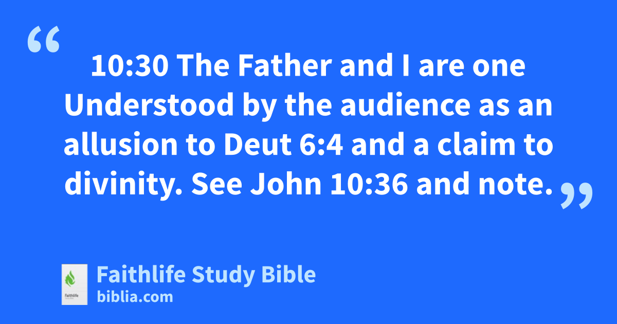 10:30 The Father and I are one Understood by the audience as an allusion to Deut 6:4 and a claim to divinity. See John 10:36 and note.
