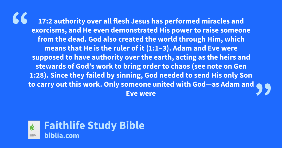 17:2 authority over all flesh Jesus has performed miracles and exorcisms, and He even demonstrated His power to raise someone from the dead. God also created the world through Him, which means that He is the ruler of it (1:1–3).