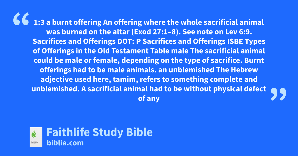 1:3 a burnt offering An offering where the whole sacrificial animal was burned on the altar (Exod 27:1–8). See note on Lev 6:9.