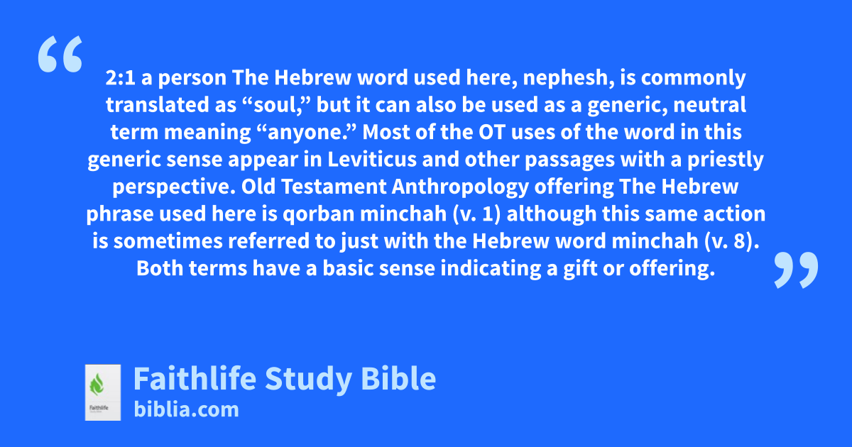 2:1 a person The Hebrew word used here, nephesh, is commonly translated as “soul,” but it can also be used as a generic, neutral term meaning “anyone.” Most of the ot uses of the word in this generic sense appear in Leviticus and other passages with a priestly perspective.