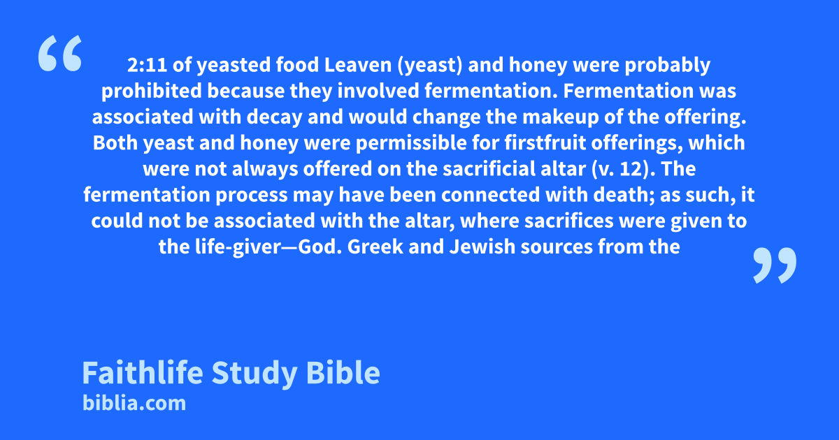 2:11 of yeasted food Leaven (yeast) and honey were probably prohibited because they involved fermentation. Fermentation was associated with decay and would change the makeup of the offering. Both yeast and honey were permissible for firstfruit offerings, which were not always offered on the sacrificial altar (v. 12).
