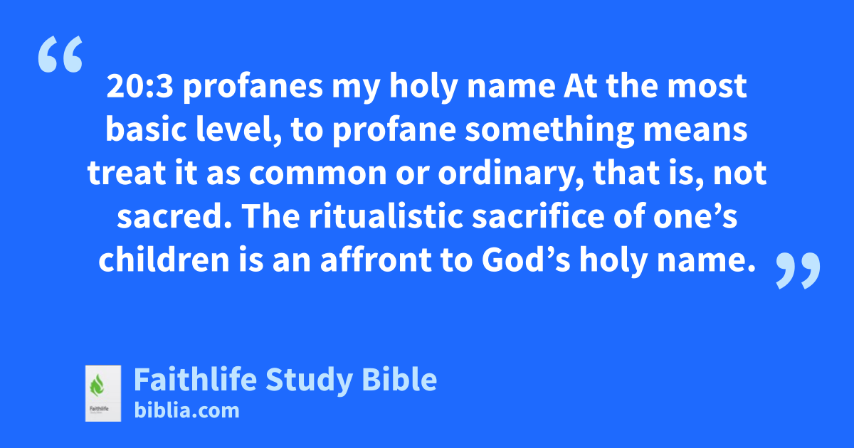 20:3 profanes my holy name At the most basic level, to profane something means treat it as common or ordinary, that is, not sacred. The ritualistic sacrifice of one’s children is an affront to God’s holy name.