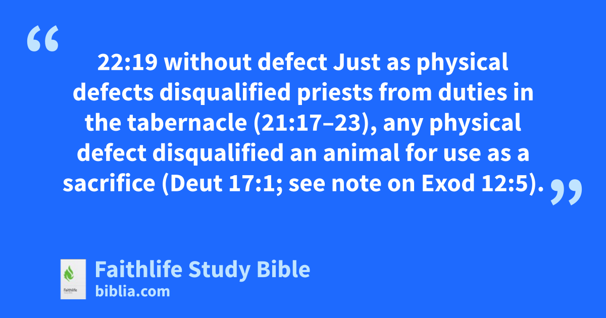 22:19 without defect Just as physical defects disqualified priests from duties in the tabernacle (21:17–23), any physical defect disqualified an animal for use as a sacrifice (Deut 17:1; see note on Exod 12:5).