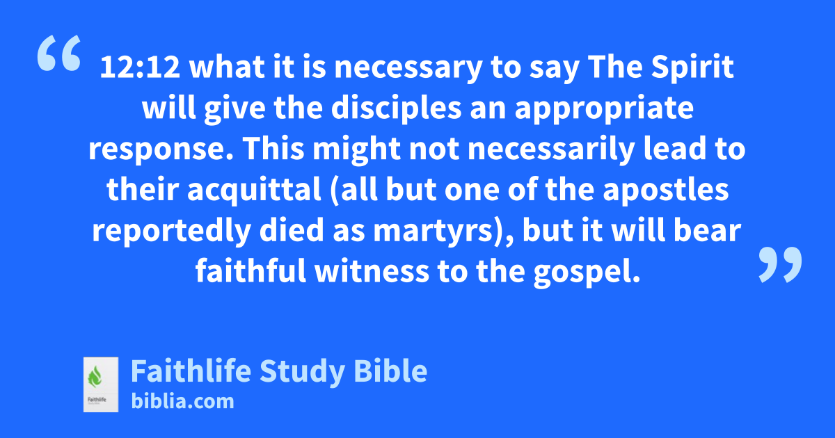 12:12 what it is necessary to say The Spirit will give the disciples an appropriate response. This might not necessarily lead to their acquittal (all but one of the apostles reportedly died as martyrs), but it will bear faithful witness to the gospel.