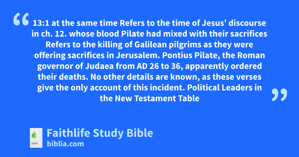 whose blood Pilate had mixed with their sacrifices Refers to the killing of Galilean pilgrims as they were offering sacrifices in Jerusalem. Pontius Pilate, the Roman governor of Judaea from ad 26 to 36, apparently ordered their deaths. No other details are known, as these verses give the only account of this incident.