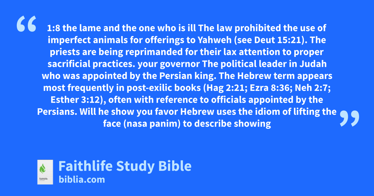 1:8 the lame and the one who is ill The law prohibited the use of imperfect animals for offerings to Yahweh (see Deut 15:21). The priests are being reprimanded for their lax attention to proper sacrificial practices.