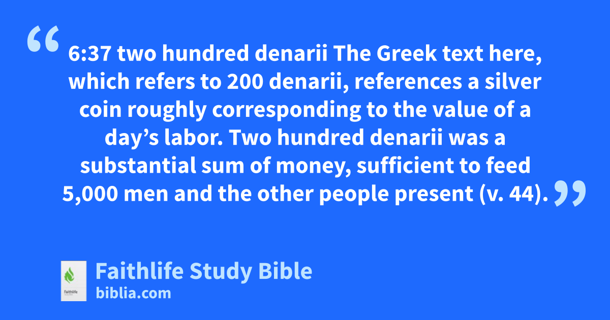 6:37 two hundred denarii The Greek text here, which refers to 200 denarii, references a silver coin roughly corresponding to the value of a day’s labor. Two hundred denarii was a substantial sum of money, sufficient to feed 5,000 men and the other people present (v. 44).