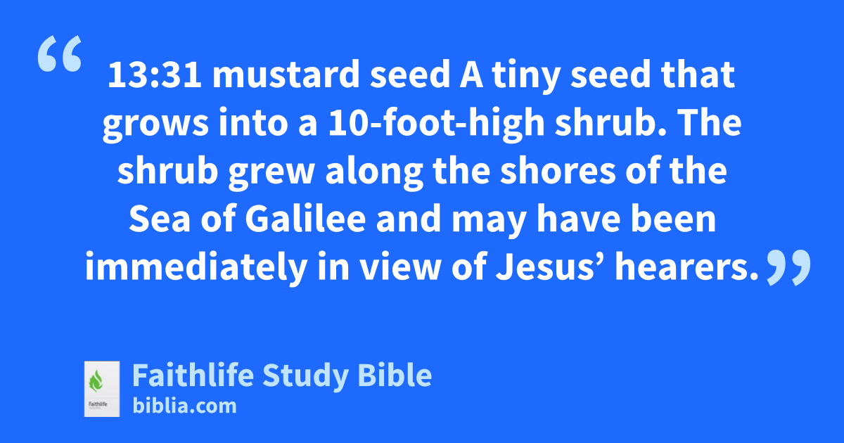 13:31 mustard seed A tiny seed that grows into a 10-foot-high shrub. The shrub grew along the shores of the Sea of Galilee and may have been immediately in view of Jesus’ hearers.