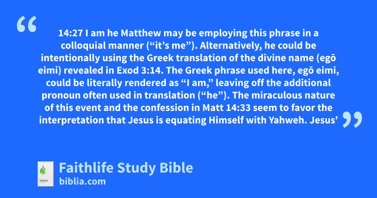 14:27 I am he Matthew may be employing this phrase in a colloquial manner (“it’s me”). Alternatively, he could be intentionally using the Greek translation of the divine name (egō eimi) revealed in Exod 3:14.