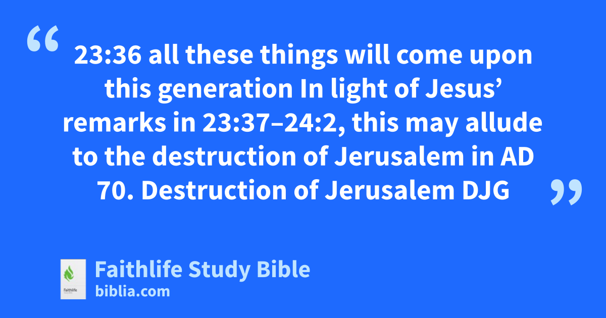23:36 all these things will come upon this generation In light of Jesus’ remarks in 23:37–24:2, this may allude to the destruction of Jerusalem in ad 70.