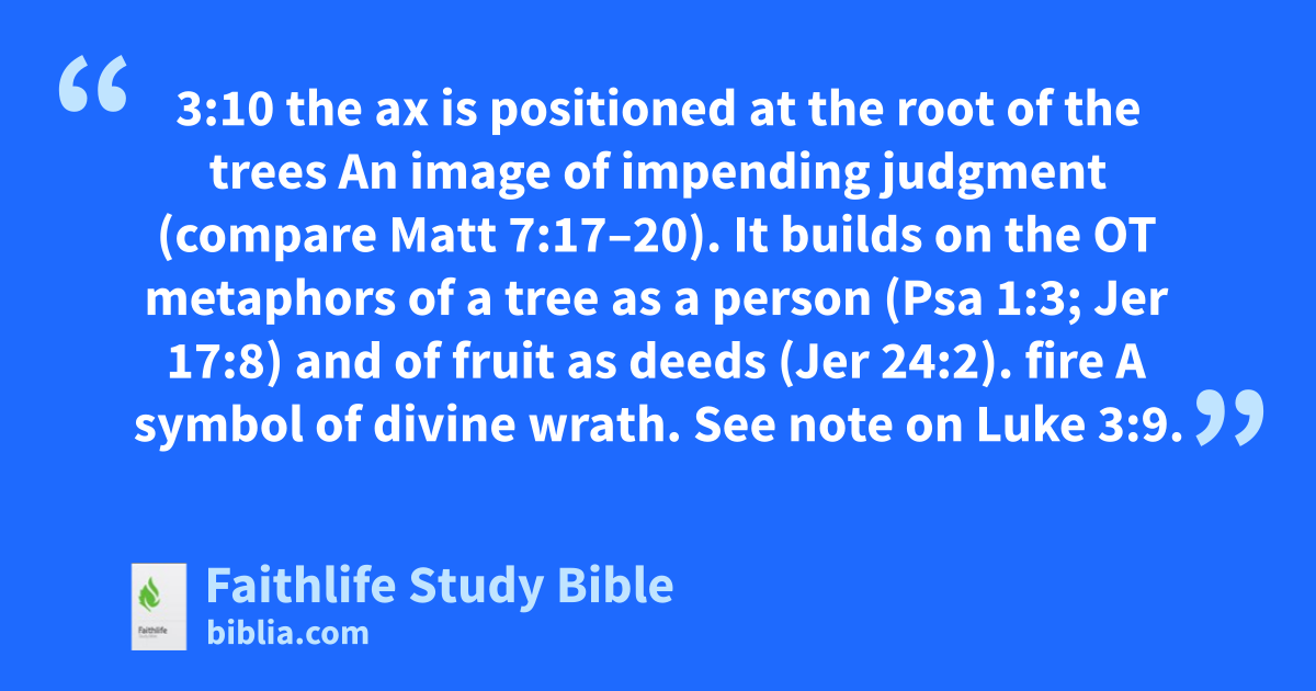 3:10 the ax is positioned at the root of the trees An image of impending judgment (compare Matt 7:17–20). It builds on the ot metaphors of a tree as a person (Psa 1:3; Jer 17:8) and of fruit as deeds (Jer 24:2).