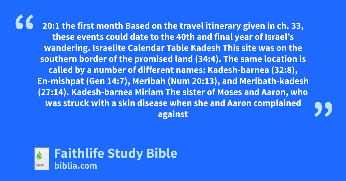 20:1–29 Chapter 20 continues the story of Israel in the wilderness. This chapter mentions the death of Miriam, Moses’ and Aaron’s sister (v. 1), and then describes Israel’s complaints about food and water (vv. 2–7; compare 21:4–9), Moses’ sin in striking the rock (vv. 7–13), Edom’s opposition to Israel passing through their territory (vv. 14–21), and the death of Aaron (vv. 22–29). |