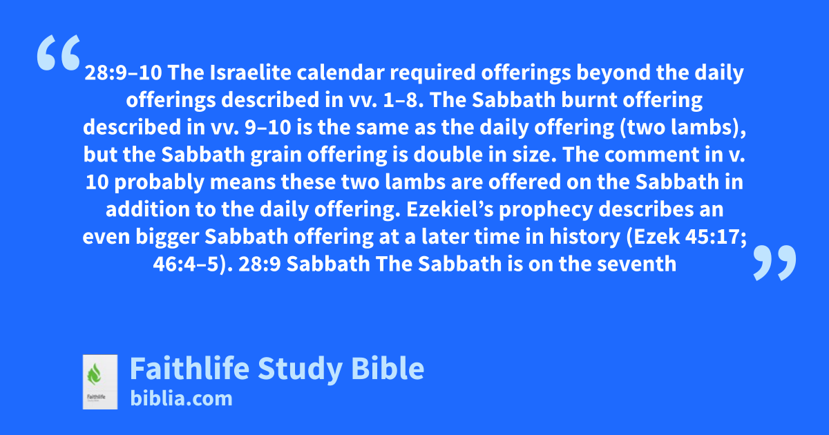 28:9 Sabbath The Sabbath is on the seventh day of each week, when the Israelites are forbidden from performing work. See Exod 20:8–11 and note.