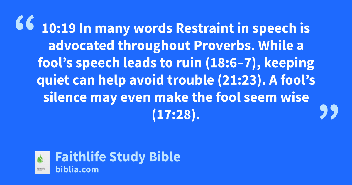 10:19 In many words Restraint in speech is advocated throughout Proverbs. While a fool’s speech leads to ruin (18:6–7), keeping quiet can help avoid trouble (21:23). A fool’s silence may even make the fool seem wise (17:28).