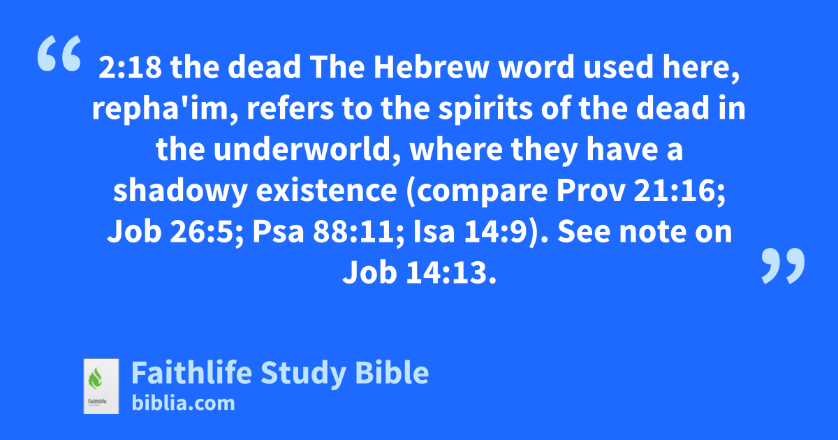 2:18 the dead The Hebrew word used here, repha'im, refers to the spirits of the dead in the underworld, where they have a shadowy existence (compare Prov 21:16; Job 26:5; Psa 88:11; Isa 14:9). See note on Job 14:13.