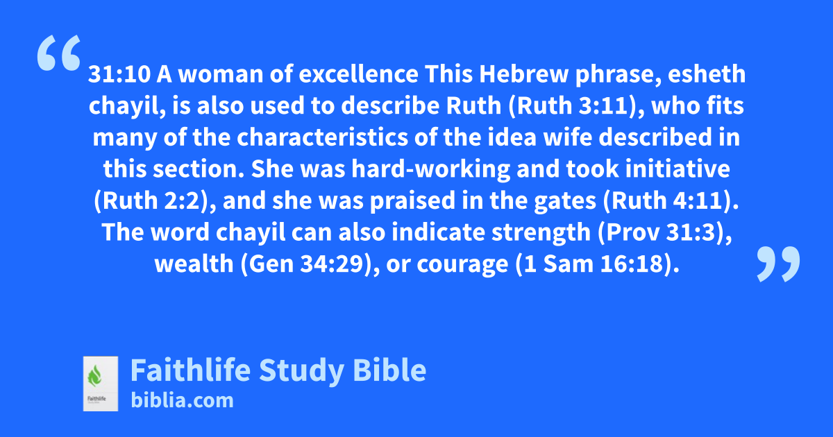 31:10 A woman of excellence This Hebrew phrase, esheth chayil, is also used to describe Ruth (Ruth 3:11), who fits many of the characteristics of the idea wife described in this section. She was hard-working and took initiative (Ruth 2:2), and she was praised in the gates (Ruth 4:11). The word chayil can also indicate strength (Prov 31:3), wealth (Gen 34:29), or courage (1 Sam 16:18).