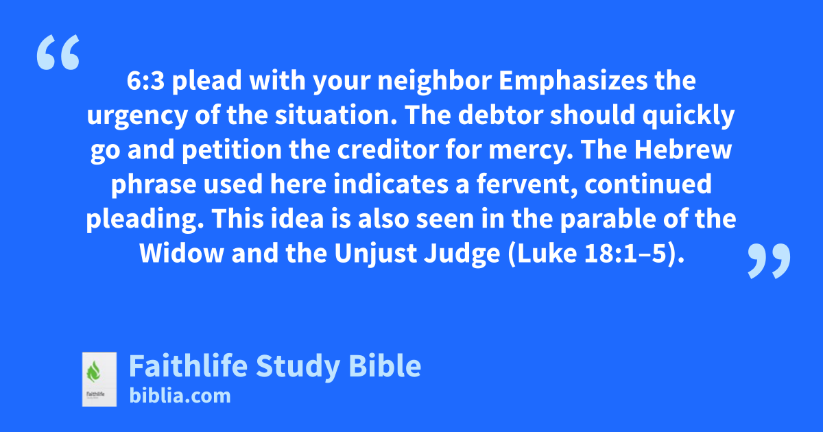 6:3 plead with your neighbor Emphasizes the urgency of the situation. The debtor should quickly go and petition the creditor for mercy. The Hebrew phrase used here indicates a fervent, continued pleading. This idea is also seen in the parable of the Widow and the Unjust Judge (Luke 18:1–5).