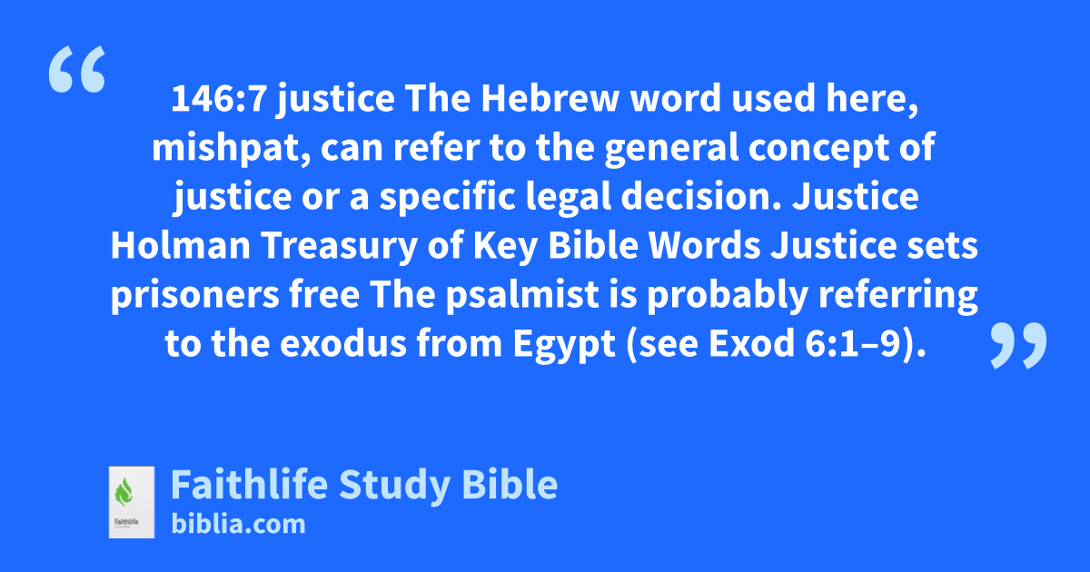 146:7 justice The Hebrew word used here, mishpat, can refer to the general concept of justice or a specific legal decision.