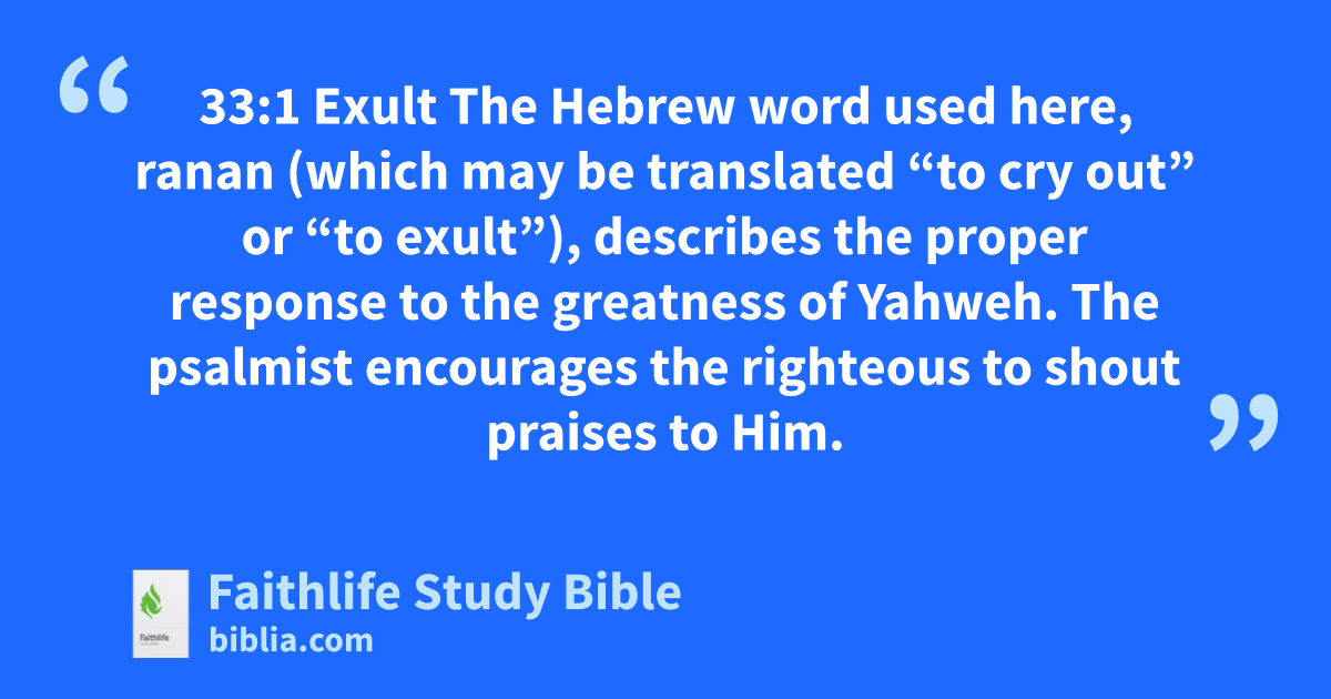 33:1 Exult The Hebrew word used here, ranan (which may be translated “to cry out” or “to exult”), describes the proper response to the greatness of Yahweh. The psalmist encourages the righteous to shout praises to Him.
