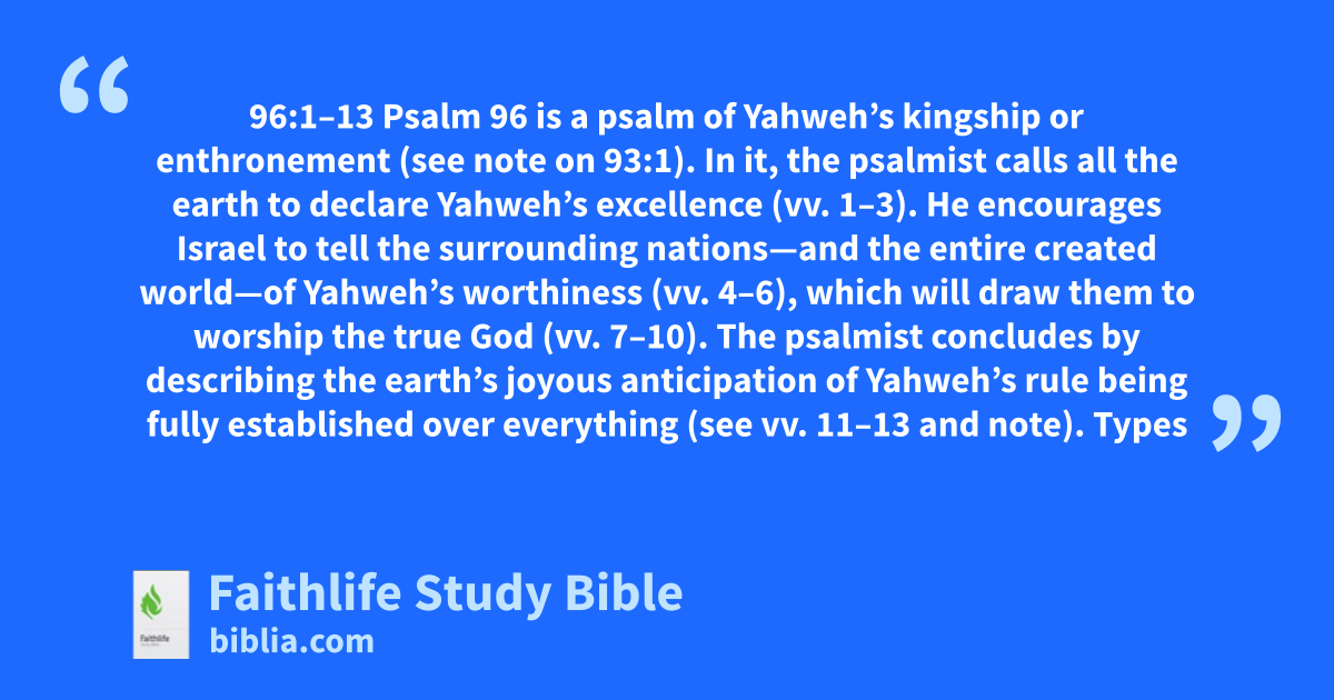 96:1–13 Psalm 96 is a psalm of Yahweh’s kingship or enthronement (see note on 93:1). In it, the psalmist calls all the earth to declare Yahweh’s excellence (vv. 1–3). He encourages Israel to tell the surrounding nations—and the entire created world—of Yahweh’s worthiness (vv. 4–6), which will draw them to worship the true God (vv. 7–10). The psalmist concludes by describing the earth’s joyous anticipation of Yahweh’s rule being fully established over everything (see vv. 11–13 and note). |