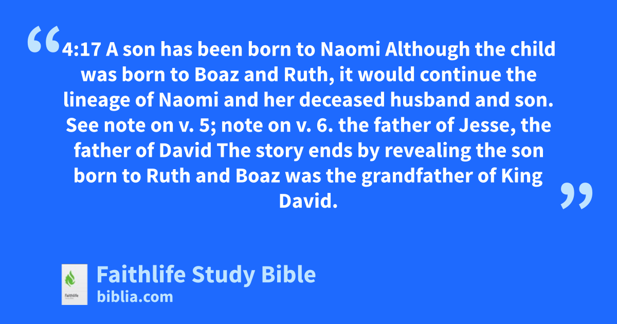 4:17 A son has been born to Naomi Although the child was born to Boaz and Ruth, it would continue the lineage of Naomi and her deceased husband and son. See note on v. 5; note on v. 6.