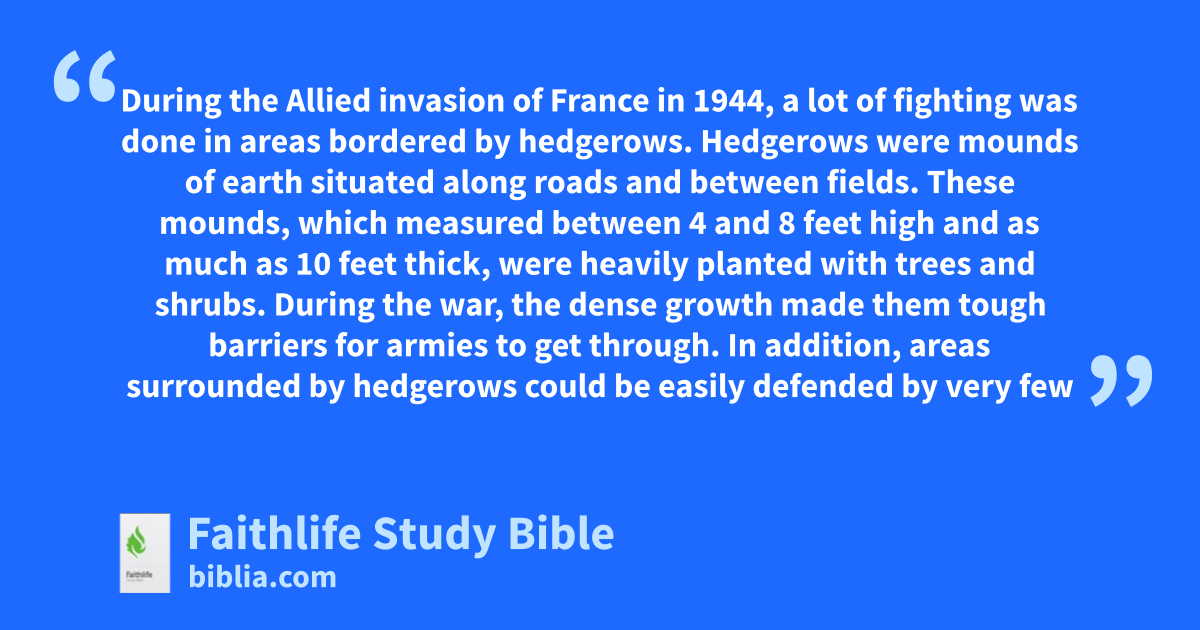 During the Allied invasion of France in 1944, a lot of fighting was done in areas bordered by hedgerows. Hedgerows were mounds of earth situated along roads and between fields. These mounds, which measured between 4 and 8 feet high and as much as 10 feet thick, were heavily planted with trees and shrubs. During the war, the dense growth made them tough barriers for armies to get through. In addition, areas surrounded by hedgerows could be easily defended by very few troops.