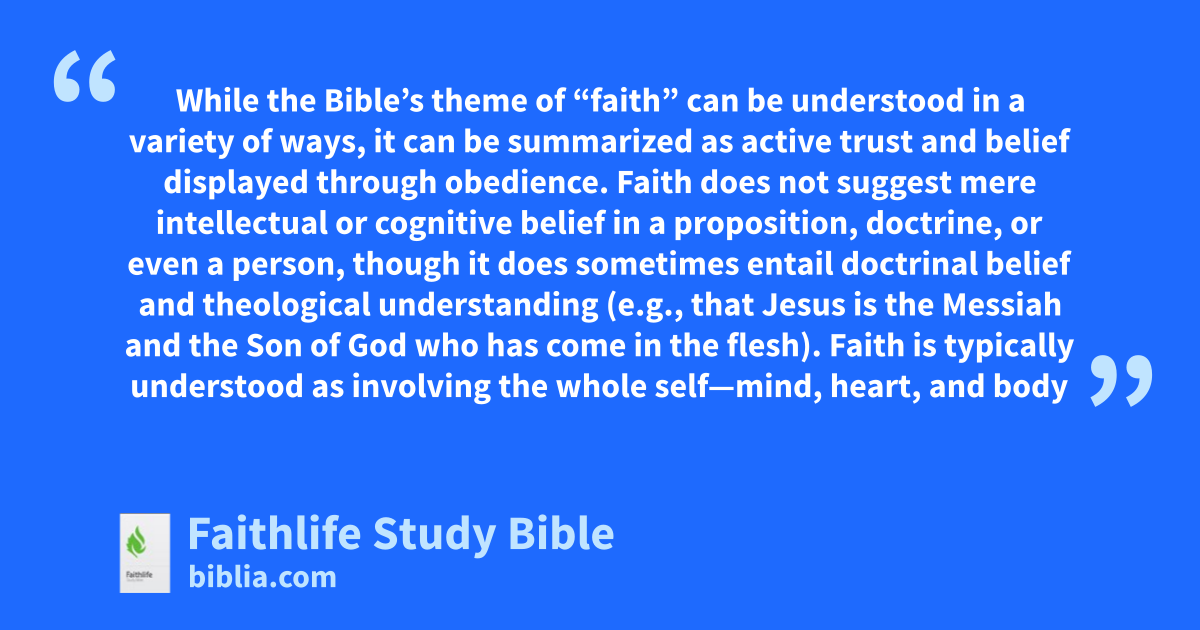 While the Bible’s theme of “faith” can be understood in a variety of ways, it can be summarized as active trust and belief displayed through obedience. Faith does not suggest mere intellectual or cognitive belief in a proposition, doctrine, or even a person, though it does sometimes entail doctrinal belief and theological understanding (e.g., that Jesus is the Messiah and the Son of God who has come in the flesh). Faith is typically understood as involving the whole self—mind, heart, and body—in a relationship with God that expresses trust and a grateful response to His loving initiative.