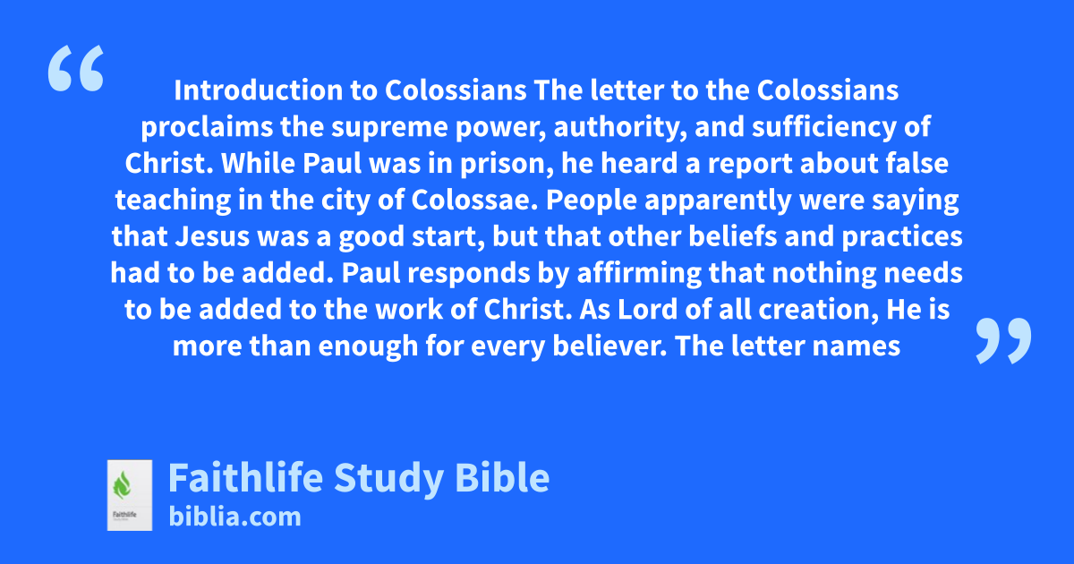 The letter to the Colossians proclaims the supreme power, authority, and sufficiency of Christ. While Paul was in prison, he heard a report about false teaching in the city of Colossae. People apparently were saying that Jesus was a good start, but that other beliefs and practices had to be added. Paul responds by affirming that nothing needs to be added to the work of Christ. As Lord of all creation, He is more than enough for every believer.