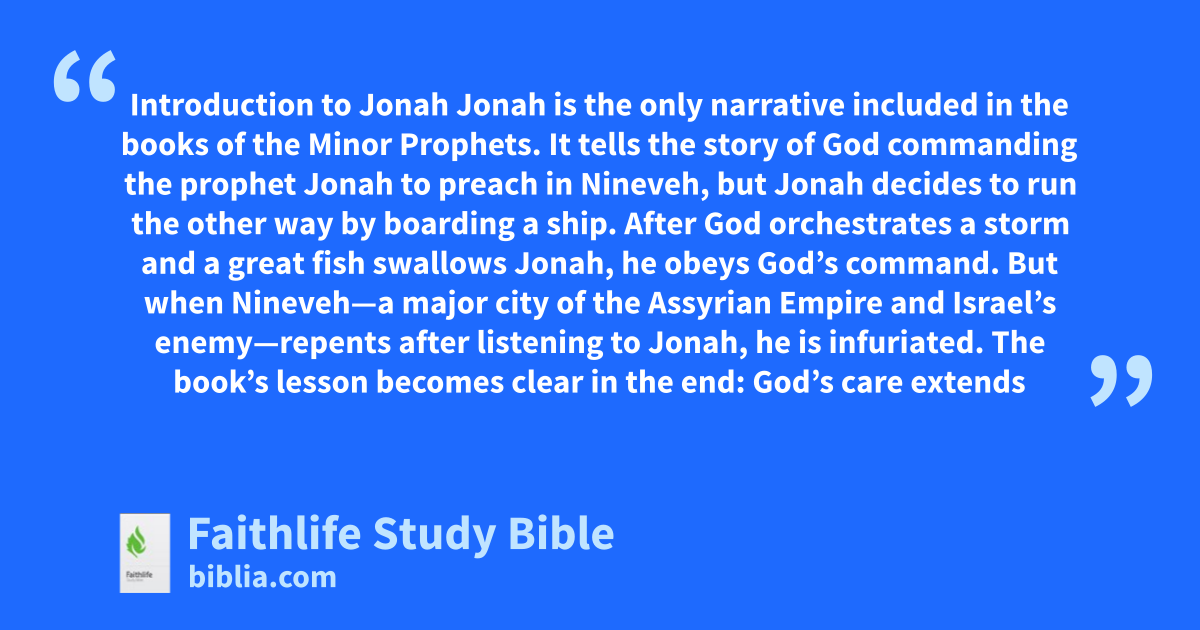 Jonah is the only narrative included in the books of the Minor Prophets. It tells the story of God commanding the prophet Jonah to preach in Nineveh, but Jonah decides to run the other way by boarding a ship. After God orchestrates a storm and a great fish swallows Jonah, he obeys God’s command. But when Nineveh—a major city of the Assyrian Empire and Israel’s enemy—repents after listening to Jonah, he is infuriated. The book’s lesson becomes clear in the end: God’s care extends to all who call on Him—even those who previously stood against His people. His mercy is truly for all.