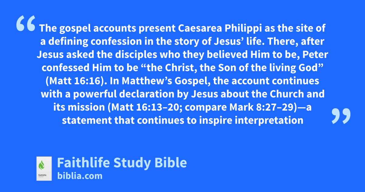 The gospel accounts present Caesarea Philippi as the site of a defining confession in the story of Jesus’ life. There, after Jesus asked the disciples who they believed Him to be, Peter confessed Him to be “the Christ, the Son of the living God” (Matt 16:16). In Matthew’s Gospel, the account continues with a powerful declaration by Jesus about the Church and its mission (Matt 16:13–20; compare Mark 8:27–29)—a statement that continues to inspire interpretation about the nature of the Church and its role in God’s redemption of creation (see note on Matt 16:18, see also note on Matt 16:19).