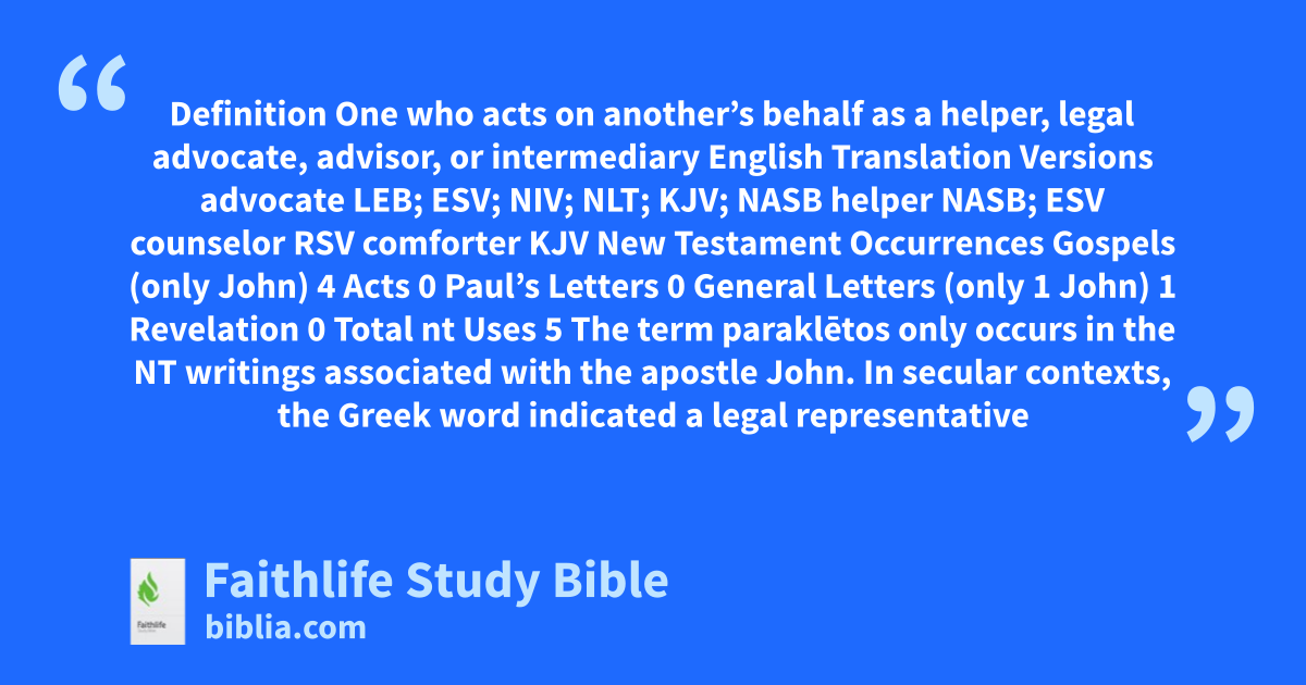 The term paraklētos only occurs in the nt writings associated with the apostle John. In secular contexts, the Greek word indicated a legal representative or lawyer who would intercede before the court on behalf of someone else.
