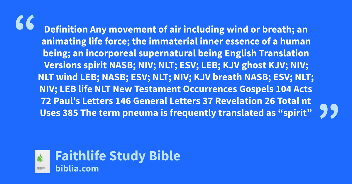 The term pneuma is frequently translated as “spirit” in the nt, but it literally means “wind” or “breath.” The features of the “wind” such as invisibility, unpredictability, and uncontrollable power are appropriately applied, in a metaphorical sense, to incorporeal supernatural beings and the immaterial “breath” that signified the essence of life. For example, Jesus describes the unpredictability and imperceptibility of the Holy Pneuma (John 3:8) and the violent, controlling power of an evil pneuma (Luke 9:42). Consequently, in addition to denoting “wind” and “breath, the term pneuma is used in Scripture to designate “spirit”—any non-material being or the power associated with that being. It can refer to various types of incorporeal beings: a ghost (Luke 24:37, 39), a good pneuma (Acts 23:8) or one that is evil (Matt 8:16).