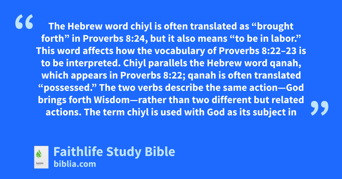 The Hebrew word chiyl is often translated as “brought forth” in Proverbs 8:24, but it also means “to be in labor.” This word affects how the vocabulary of Proverbs 8:22–23 is to be interpreted. Chiyl parallels the Hebrew word qanah, which appears in Proverbs 8:22; qanah is often translated “possessed.” The two verbs describe the same action—God brings forth Wisdom—rather than two different but related actions.