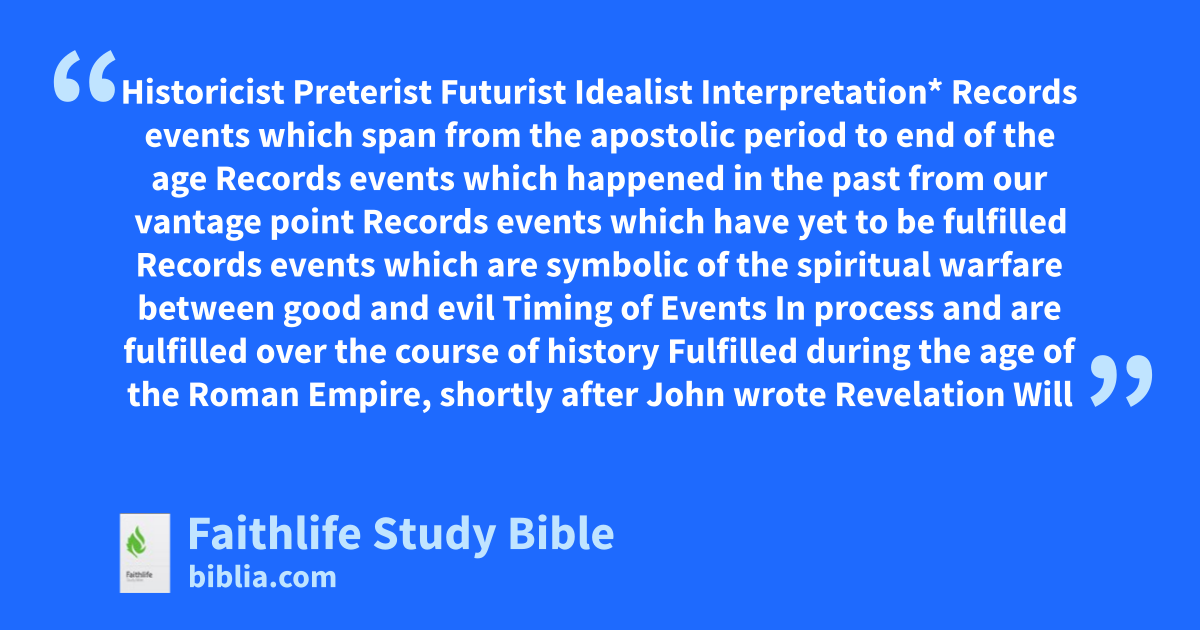 Interpretation* | Records events which span from the apostolic period to end of the age | Records events which happened in the past from our vantage point | Records events which have yet to be fulfilled | Records events which are symbolic of the spiritual warfare between good and evil |