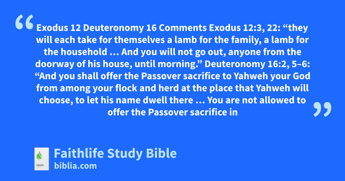 Exodus 12:7: | Not mentioned | According to Exodus, the Israelites are to apply some of the blood to the doorposts and lintels of their houses. Deuteronomy omits this because the people are not to celebrate Passover in their homes. |