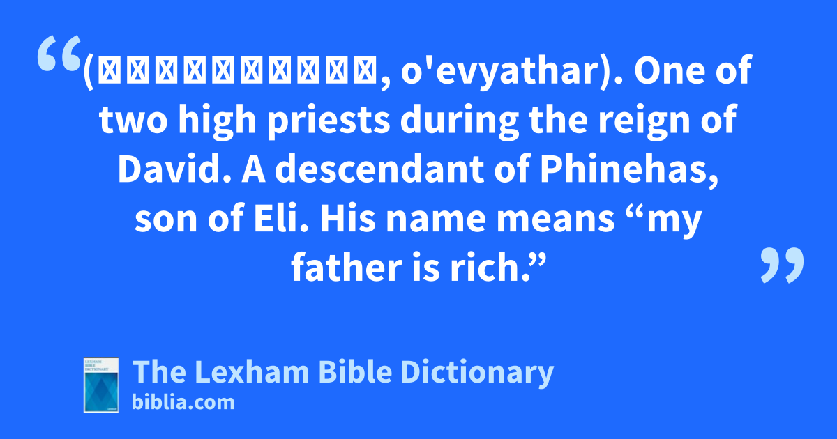 Abiathar, Son of Ahimelech (ֹאֶבְיָתָר, o'evyathar). One of two high priests during the reign of David. A descendant of Phinehas, son of Eli. His name means “my father is rich.”
