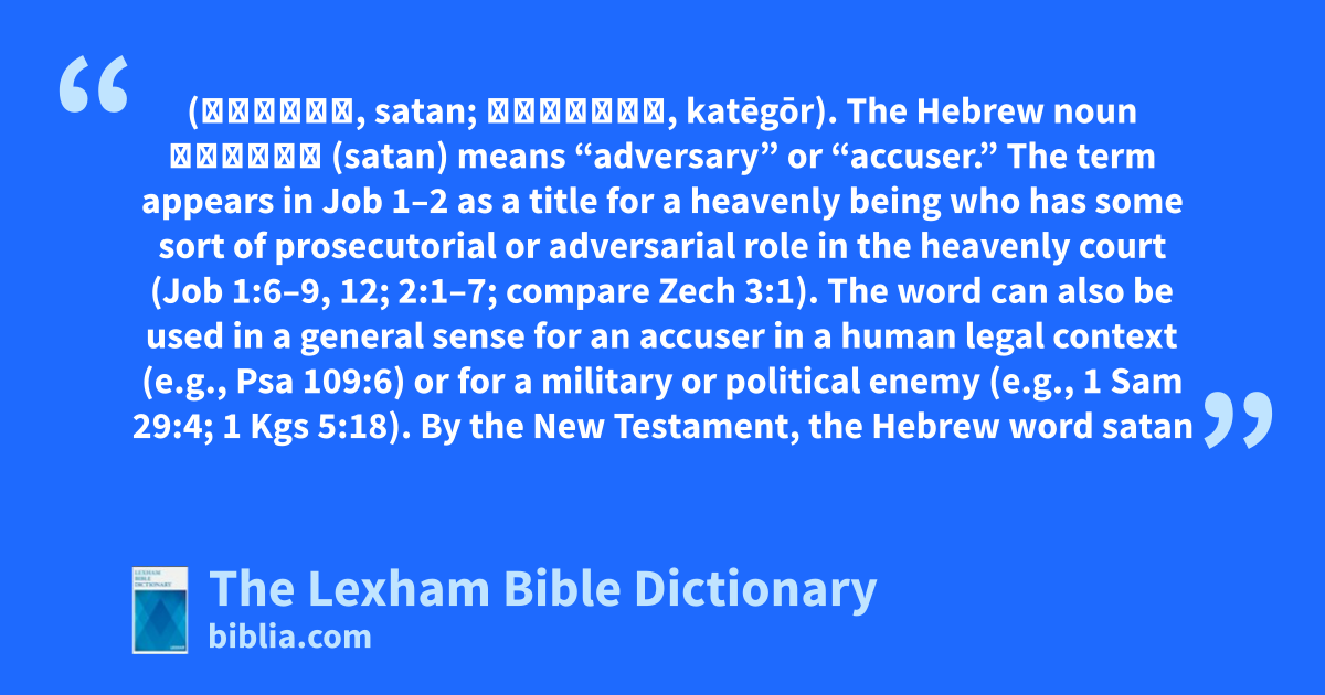 Accuser (שָׂטָן, satan; κατήγωρ, katēgōr). The Hebrew noun שָׂטָן (satan) means “adversary” or “accuser.” The term appears in Job 1–2 as a title for a heavenly being who has some sort of prosecutorial or adversarial role in the heavenly court (Job 1:6–9, 12; 2:1–7; compare Zech 3:1). The word can also be used in a general sense for an accuser in a human legal context (e.g., Psa 109:6) or for a military or political enemy (e.g., 1 Sam 29:4; 1 Kgs 5:18). By the New Testament, the Hebrew word satan has come into Greek as Σᾰτάν (Sătan), a name for the devil (e.g., Luke 13:16). This being’s role as an accuser is mentioned once in the NT where Satan is called ὁ κατήγωρ (ho katēgōr, “the accuser”; Rev 12:9–10). For further information, see these articles: Satan; Satan in the Second Temple Period; Devil.