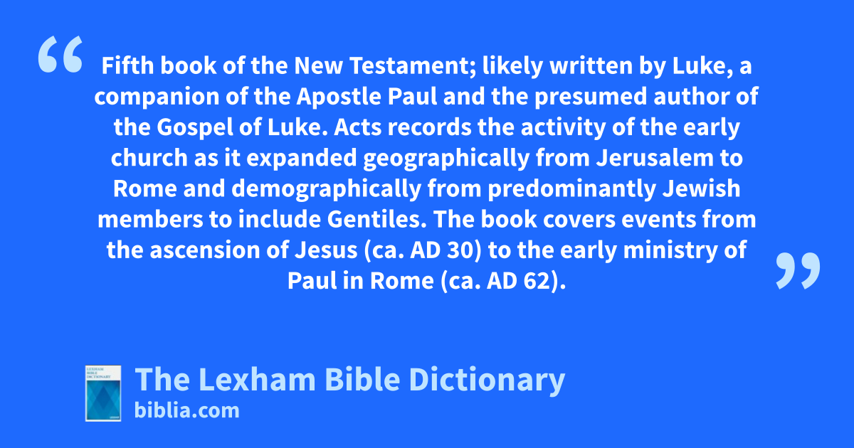 Acts of the Apostles Fifth book of the New Testament; likely written by Luke, a companion of the Apostle Paul and the presumed author of the Gospel of Luke. Acts records the activity of the early church as it expanded geographically from Jerusalem to Rome and demographically from predominantly Jewish members to include Gentiles. The book covers events from the ascension of Jesus (ca. ad 30) to the early ministry of Paul in Rome (ca. ad 62).