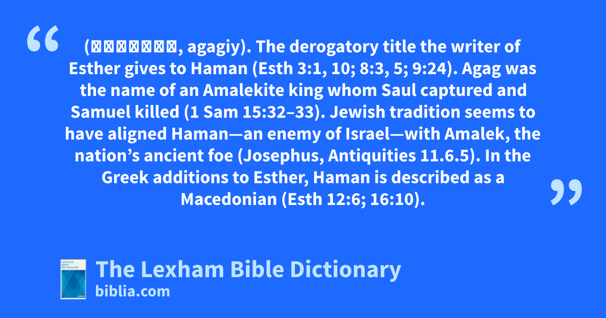 Agagite (אֲגָגִי, agagiy). The derogatory title the writer of Esther gives to Haman (Esth 3:1, 10; 8:3, 5; 9:24). Agag was the name of an Amalekite king whom Saul captured and Samuel killed (1 Sam 15:32–33). Jewish tradition seems to have aligned Haman—an enemy of Israel—with Amalek, the nation’s ancient foe (Josephus, Antiquities 11.6.5). In the Greek additions to Esther, Haman is described as a Macedonian (Esth 12:6; 16:10).