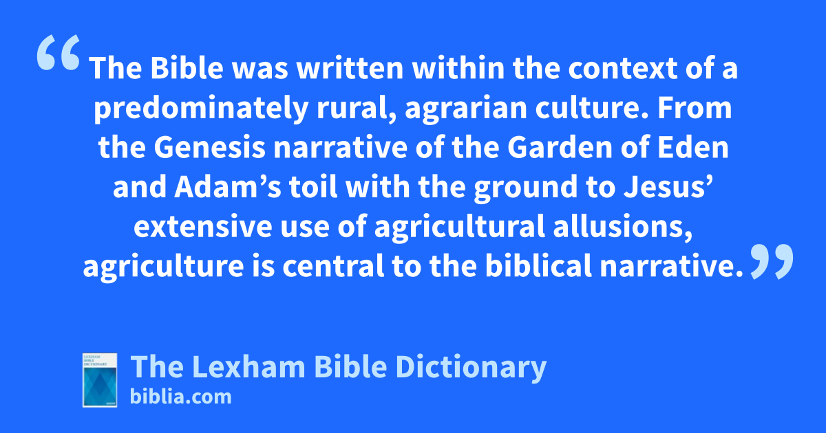 Agriculture The Bible was written within the context of a predominately rural, agrarian culture. From the Genesis narrative of the Garden of Eden and Adam’s toil with the ground to Jesus’ extensive use of agricultural allusions, agriculture is central to the biblical narrative.