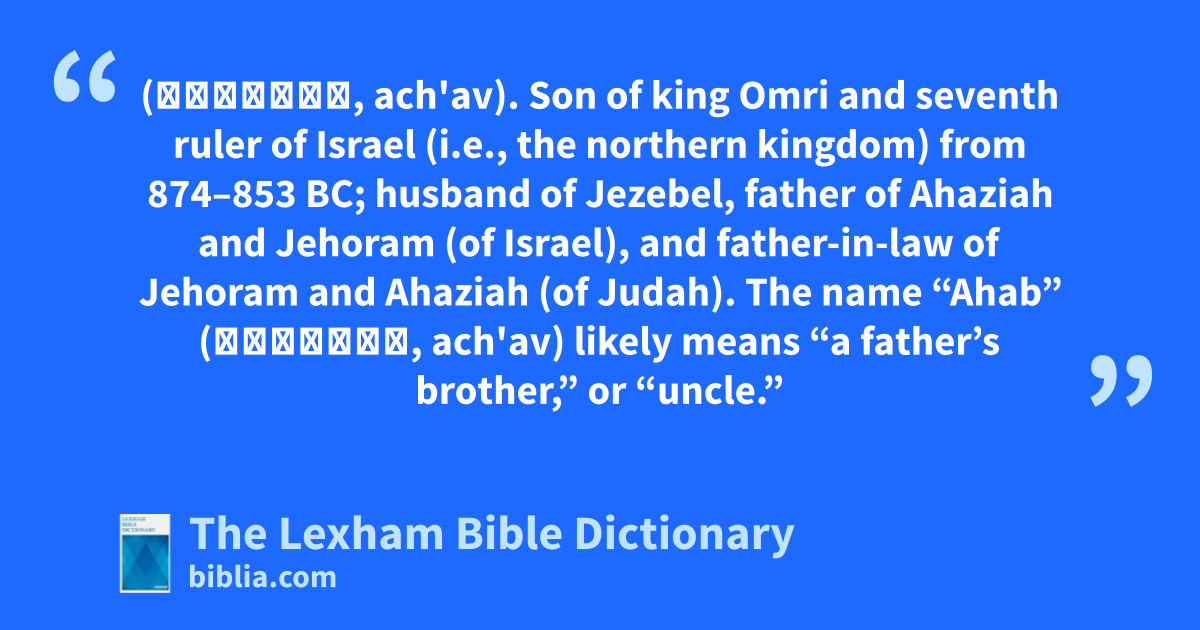 Ahab, King of Israel (אַחְאָב, ach'av). Son of king Omri and seventh ruler of Israel (i.e., the northern kingdom) from 874–853 bc; husband of Jezebel, father of Ahaziah and Jehoram (of Israel), and father-in-law of Jehoram and Ahaziah (of Judah). The name “Ahab” (אַחְאָב, ach'av) likely means “a father’s brother,” or “uncle.”