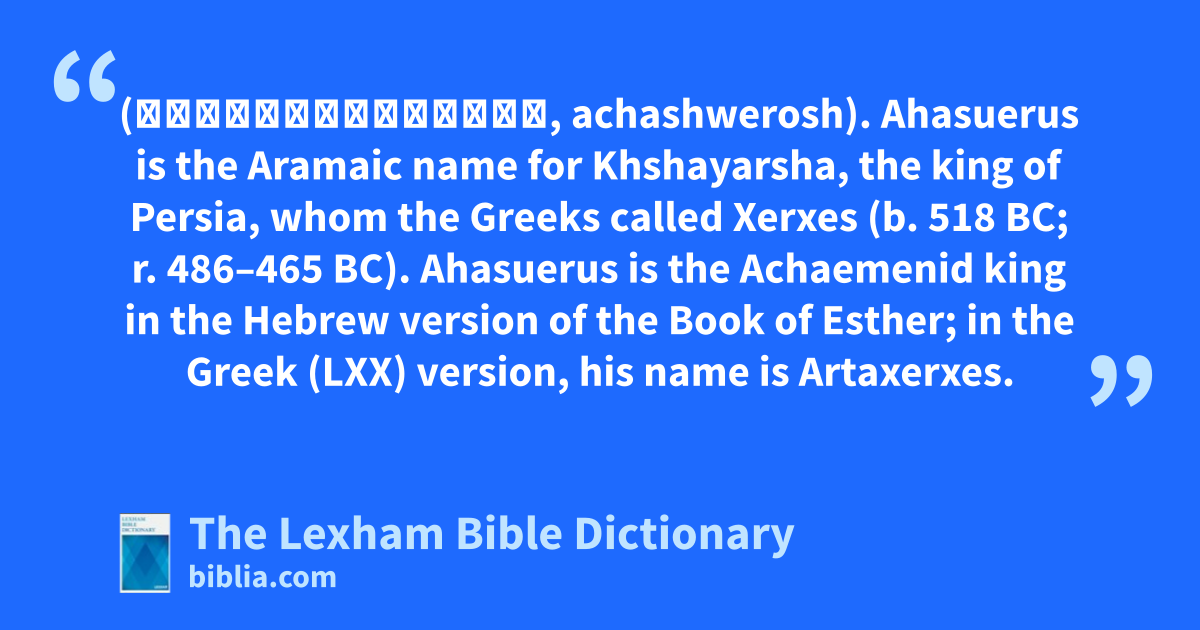 Ahasuerus the King (אֲחַשְׁוֵרוֹשׁ, achashwerosh). Ahasuerus is the Aramaic name for Khshayarsha, the king of Persia, whom the Greeks called Xerxes (b. 518 bc; r. 486–465 bc). Ahasuerus is the Achaemenid king in the Hebrew version of the Book of Esther; in the Greek (LXX) version, his name is Artaxerxes.