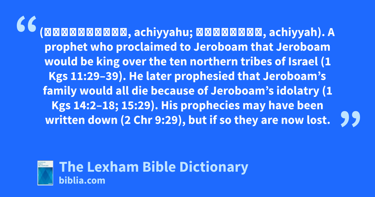 Ahijah the Prophet (אֲחִיָּהוּ, achiyyahu; אֲחִיָּה, achiyyah). A prophet who proclaimed to Jeroboam that Jeroboam would be king over the ten northern tribes of Israel (1 Kgs 11:29–39). He later prophesied that Jeroboam’s family would all die because of Jeroboam’s idolatry (1 Kgs 14:2–18; 15:29). His prophecies may have been written down (2 Chr 9:29), but if so they are now lost.