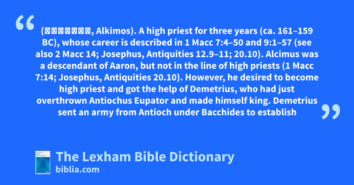 Alcimus was a descendant of Aaron, but not in the line of high priests (1 Macc 7:14; Josephus, Antiquities 20.10). However, he desired to become high priest and got the help of Demetrius, who had just overthrown Antiochus Eupator and made himself king. Demetrius sent an army from Antioch under Bacchides to establish Alcimus in the high priesthood at Jerusalem.