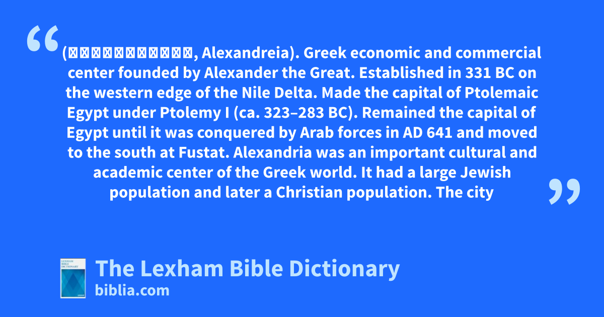 Alexandria (Ἀλεξάνδρεια, Alexandreia). Greek economic and commercial center founded by Alexander the Great. Established in 331 bc on the western edge of the Nile Delta. Made the capital of Ptolemaic Egypt under Ptolemy I (ca. 323–283 bc). Remained the capital of Egypt until it was conquered by Arab forces in ad 641 and moved to the south at Fustat. Alexandria was an important cultural and academic center of the Greek world. It had a large Jewish population and later a Christian population. The city itself occurs in the Bible only in passing reference to people and ships coming from there.
