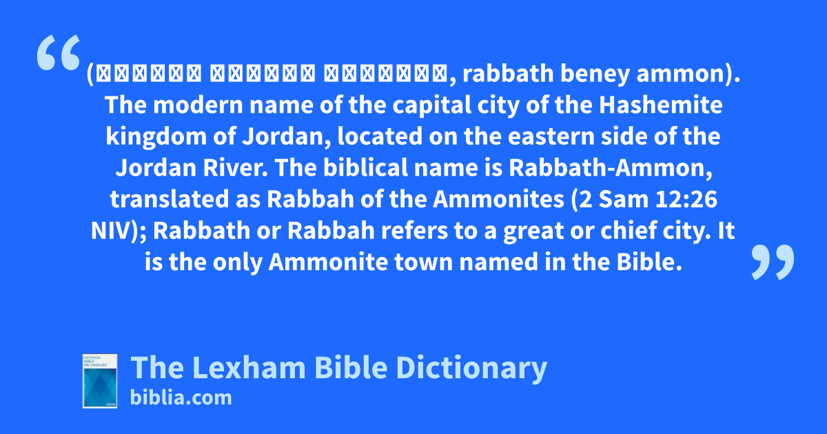 Amman (רַבַּת בְּנֵי עַמּוֹן, rabbath beney ammon). The modern name of the capital city of the Hashemite kingdom of Jordan, located on the eastern side of the Jordan River. The biblical name is Rabbath-Ammon, translated as Rabbah of the Ammonites (2 Sam 12:26 NIV); Rabbath or Rabbah refers to a great or chief city. It is the only Ammonite town named in the Bible.