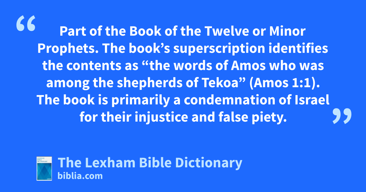 Amos, Book Of Part of the Book of the Twelve or Minor Prophets. The book’s superscription identifies the contents as “the words of Amos who was among the shepherds of Tekoa” (Amos 1:1). The book is primarily a condemnation of Israel for their injustice and false piety.