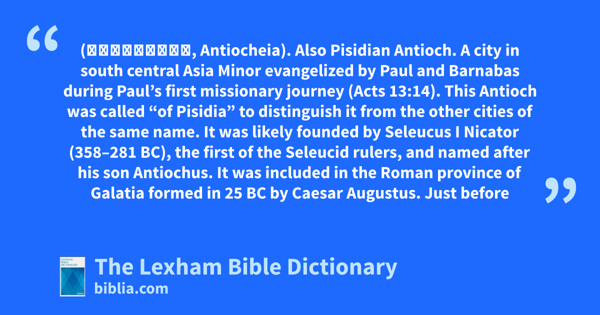 Antioch of Pisidia (Ἀντιόχεια, Antiocheia). Also Pisidian Antioch. A city in south central Asia Minor evangelized by Paul and Barnabas during Paul’s first missionary journey (Acts 13:14).