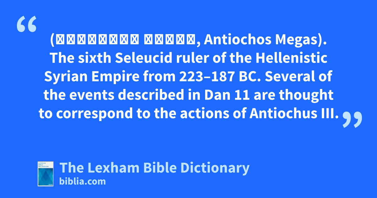 Antiochus III the Great (Ἀντίοχος Μέγας, Antiochos Megas). The sixth Seleucid ruler of the Hellenistic Syrian Empire from 223–187 bc. Several of the events described in Dan 11 are thought to correspond to the actions of Antiochus III.