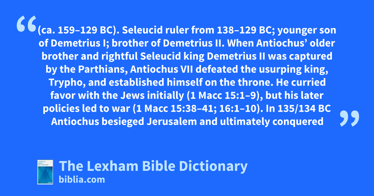 Antiochus VII Sidetes (ca. 159–129 bc). Seleucid ruler from 138–129 bc; younger son of Demetrius I; brother of Demetrius II. When Antiochus’ older brother and rightful Seleucid king Demetrius II was captured by the Parthians, Antiochus VII defeated the usurping king, Trypho, and established himself on the throne.